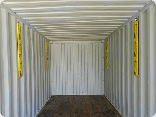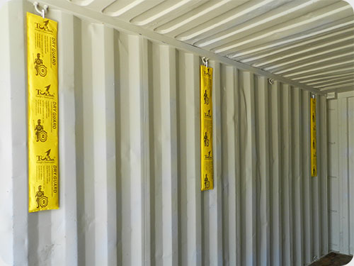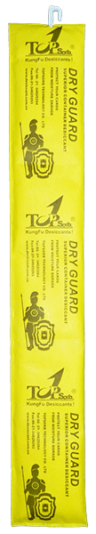 4. Hang Dry Guard and recommended dosage:Open the package and hang dry guard 1000 up to the iron hoop on the container wall,as shown in the picture,Use 4pcs~6pcs per 20’ container,8pcs~12pcs per 40’ container.For professional advice of desiccant dosage,please contact Topsorb.